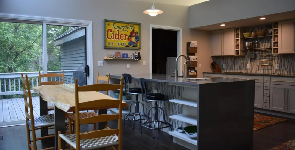 Live in a tree house, with walls of windows across the upper and lower living areas and private decks overlooking the Scioto.